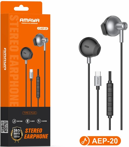The AMAYA AEP-20 Stereo Earphones are designed for listeners who value crisp audio performance and modern compatibility. Featuring a sleek, metallic design and a Type-C connector, the AEP-20 is the ideal companion for your latest devices, delivering high-quality sound and clear communication wherever you go.